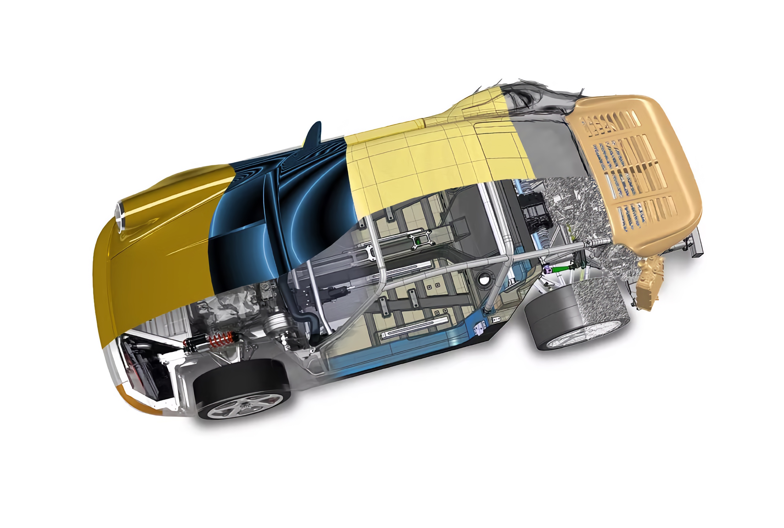 - Our blueprints reveal the integration of battery modules within the center of gravity, achieving a weight distribution that honors the original “rear-engine” feel while optimizing for EV balance.
